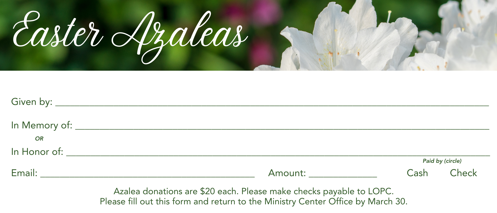 Again this Easter, LOPC will continue its well-loved tradition of adorning the sanctuary with white azaleas. You can sign up on the plaza after worship on March 15, 22, and 29 or you can print and mail or drop this form to the Ministry Center office. All mailed requests must be received by March 30. A list of azalea dedications will be published in the Easter bulletins. Those who have donated azaleas may take their plant(s) home with them after the 11:00 a.m. Easter service or they can be picked up from the Sanctuary narthex April 6 – 8. Use one form per dedication.
